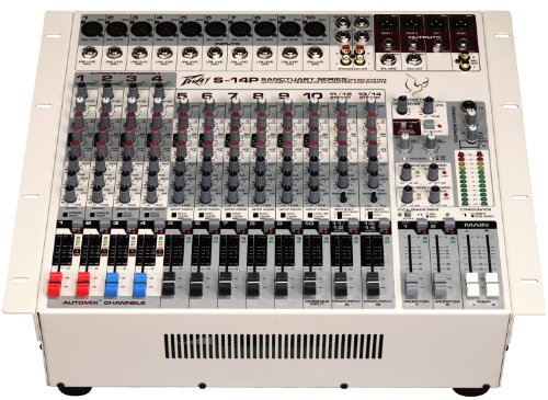 Peavey S14 12 Channel Powered Sanctuary Series Mixer?The Sanctuary Series S-14 mixer is a 12-channel, rack-mountable mixing console designed specifically for houses of worship. Since many worship centers do not have an experienced sound technician on staff, Peavey designed the S-14 with several unique, user-friendly features to simplify operation. Any church leader or choir director can use the S-14 with confidence. One of this mixer's innovations is Automix(tm) technology, an automatic mixing function provided on the first four channels. Once engaged, Automix monitors the levels on these channels and automatically turns down unused or low priority inputs to give dominance to the main microphone, minimizing ambient noise and feedback. The S-14 also includes a built-in Feedback Ferret(r) automatic digital feedback elimination system on the Main and Monitor 1 outputs. The Feedback Ferret applies a narrow notch filter on specific problem frequencies to eliminate feedback without sacrificing tonal quality. The device continuously checks and rechecks the designated problem frequencies and then releases the filter(s) when it no longer detects feedback. Another feature unique to the S-14 is Mid-Morph equalization, which is actually two EQ controls in one. When the knob is cut, it pulls out low-mid frequencies that muddy the sound; when boosted, it shifts to an upper-mid frequency that brightens the vocal range. Every channel includes Mid-Morph EQ as well as normal low and high EQ. The stereo line channels also accommodate split-accompaniment audio tracks. The accompaniment can be played to the main system in stereo or from the left or right inputs, while the Monitor Blend control allows any mix of vocals and accompaniment to be sent to the monitors. In addition, the S-14 features digital reverb with four presets and a mute; vocal enhancer; compression and much more.