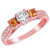 | ✚✚✚ 18K Rose Gold Round 3 Stone Diamond and Fire Opal Ring With Milgrain Pave Set Shank (0.95 ctw) Size This dazzling sparkling timeless ring is classic and can be used as an engagement ring, anniversary ring, bridal ring, promise ring, proposal ring, fashion ring, wedding ring, cocktail ring and also to represent eternal love between you and that special someone. This 18K rose gold diamond ring is prong set with 1 round diamond and 2 round Fire Opal gemstones. There also also 10 sparkly diamonds on the shank of this ring (5 on each side). The total carat weight of all the stones are approximately 0.95 carats. The diamonds are H-I color and SI-I2 clarity. The ring band measures approximately 1.80 mm wide and 1.0 mm thick.