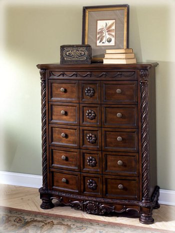 FeaturesMade with select hardwood veneers, hardwood solids and furniture grade resinDark casual finishDark colored metal accents & hardwareLarge scale decorative pilasters and ornately detailed appliques "Famous Collection" Chest inBrown By "Famous Brand" # 64-355B # 64-355B # 64-355B?