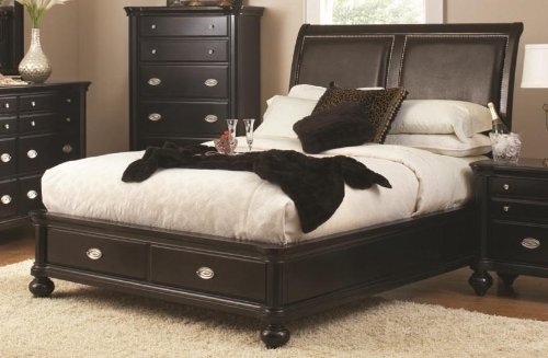 Woodville Platform Bed California King?A champion of craftsmanship, design, style and function, this beautiful bed will make the perfect centerpiece to your bedroom. A stylish slight curved headboard features padded black leather like vinyl with nickel finish nailheads and the footboard features two storage drawers for extra bedroom storage. The nickel finished hardware on the storage drawers along with the bun feet give this already stylish bed and added touch of traditional style.Style TransitionalFabric VinylHeight 58.25Finish Dark WoodColor BlackBed Size California KingWidth 81Length 100