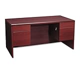 Hard-working, good-looking and built to survive a lifetime of overtime. Thermally-fused laminate top and end panels are abrasion- and stain-resistant. Drawers operate on ball bearing suspensions; file drawers extend fully and accommodate letter or legal size hanging files, box drawers extend three-quarters. HON® "One Key" core removable locks make re-keying quick and easy. Full-height modesty panel for privacy. Two cord management grommets. Color: Mahogany; Pedestal Count: 2; Top Shape: Rectangular.