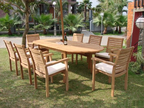Grade-A Teak Wood Luxurious Dining Set Collections: 9 Pc - 94" Oval Table and 8 Hari Stacking Arm Chairs?Our products are made and distributed by TeakStation and also shipped by TeakStation. We at TeakStation do not use third party service to ship our orders and offer our best service and quality to our customers. Set includes: 94" Oval Table and 8 Arm Stacking Chairs. The chairs are very comfortable and you can lengthen the table opening the butterfly leaf extensions. Some pictures are shown with more chairs for illustration purpose only.** Wood Umbrella Hole Plug is also provided. ** 2" Umbrella Hole is available in the middle of the table. ** Umbrella is not included with the set, but can be purchase separately, please inquire. ** DON'T FORGET TO ENQUIRE ABOUT OUR SUNBRELLA CUSHIONS (SOLD SEPARATELY) ** If you need more chairs, please let us know. ** Assembly: Very little assembly is required. This furniture will be delivered in partially assembled sections. Assembly is quick and simple. **Accessories shown in picture are not included with the set. Please inquire if you are interested.